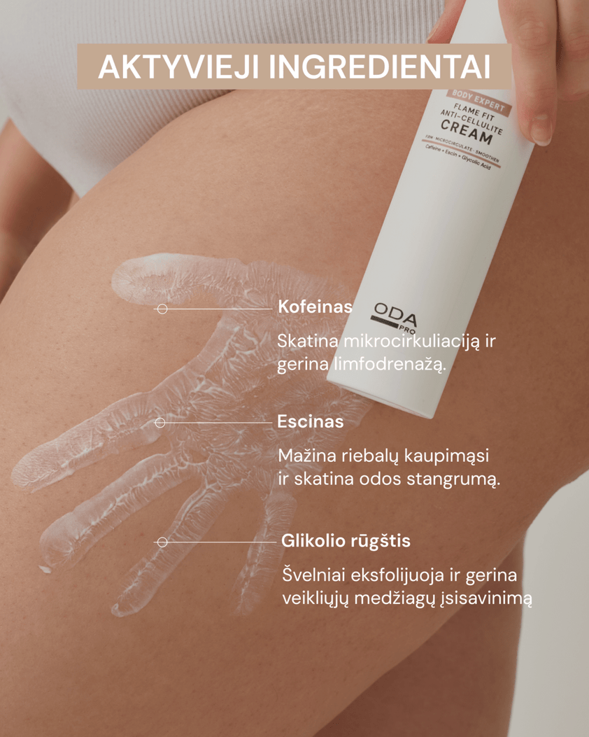 1 LYGIS: RIEBALŲ SANKAUPOS DEGINIMASkofeinas veikia kaip stimuliatorius, skatina mikrocirkuliaciją ir gerina limfodrenažą, padėdamas sumažinti riebalų sankaupas bei celiulito požymius.