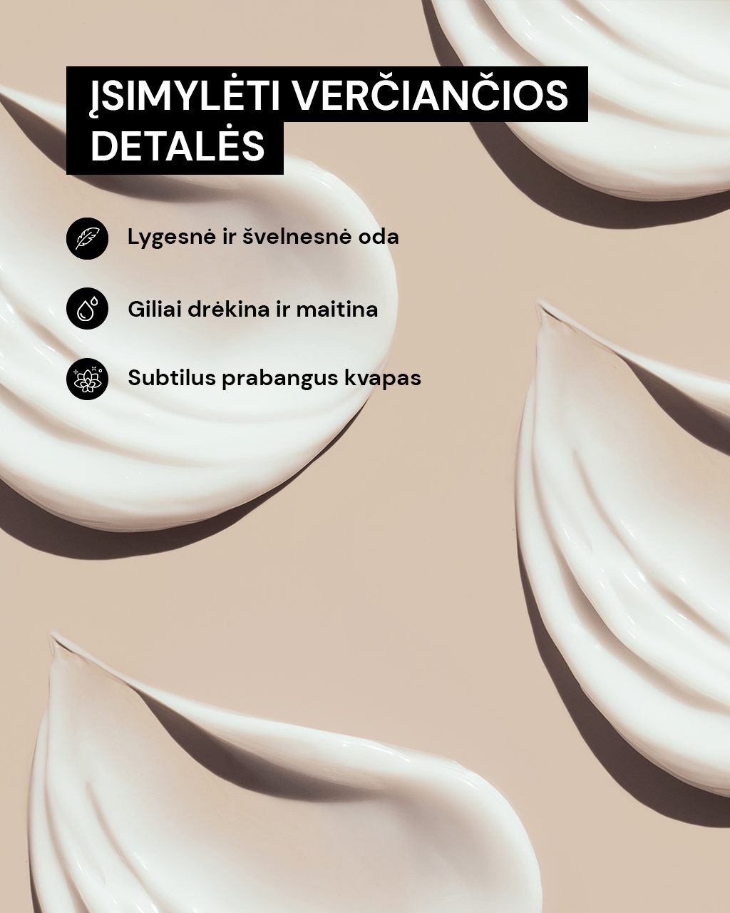 PRIVALUMAI: Intensyviai drėkina ir maitina + Atkuria odos stangrumą + Suteikia aksominį švelnumą